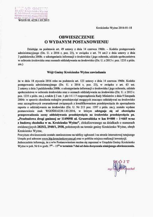 o wydanej decyzji o środowiskowych uwarunkowaniach zgody na realizację przedsięwzięcia pn.: "Przebudowa drogi gminnej nr 114909R ul. Grunwaldzka w km 0+000 - 1+665 wraz z budową chodnika w m. Krościenko Wyżne".