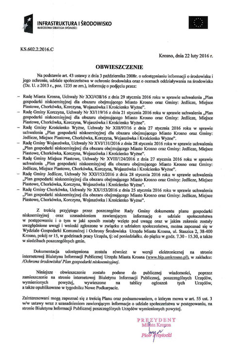 Obwieszczenie w sprawie uchwalenia "Planu gospodarki niskoemisyjnej dla obszaru obejmującego Miasto Krosno oraz Gminy: Jedlicze, Miejsce Piastowe, Chorkówka, Korczyna, Wojaszówka i Krościenko Wyżne".