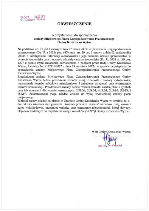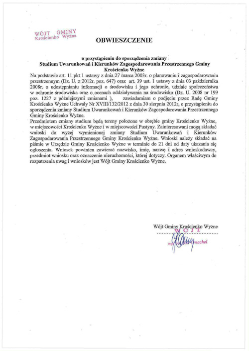 Wójt Gminy Krościenko Wyżne zawiadamia