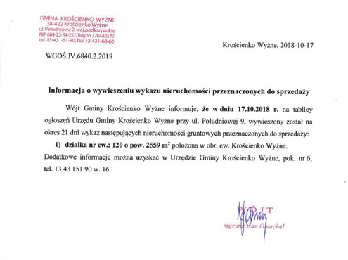 Wójt Gminy Krościenko Wyżne informuje, że w dniu 07.03.2018 r. na tablicy ogłoszeń Urzędu Gminy Krościenko Wyżne przy ul. Południowej 9, wywieszony zostanie na okres 21 dni wykaz następujących nieruchomości gruntowych przeznaczonych do oddania w dzierżawę na czas nieoznaczony: